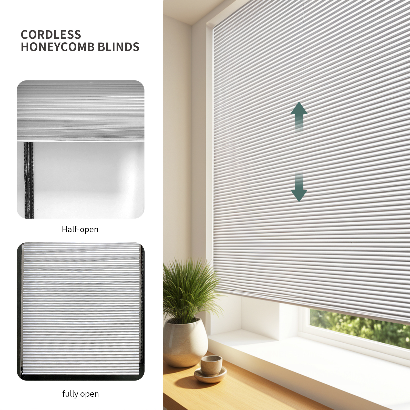 The cordless honeycomb shades combine child and pet safety features, with no risk of entanglement and a neat, tidy appearance, creating a safer home environment. With a simple pull, you can easily adjust light and airflow, with smooth, effortless lifting, while gently filtering sunlight, balancing practicality and safety.