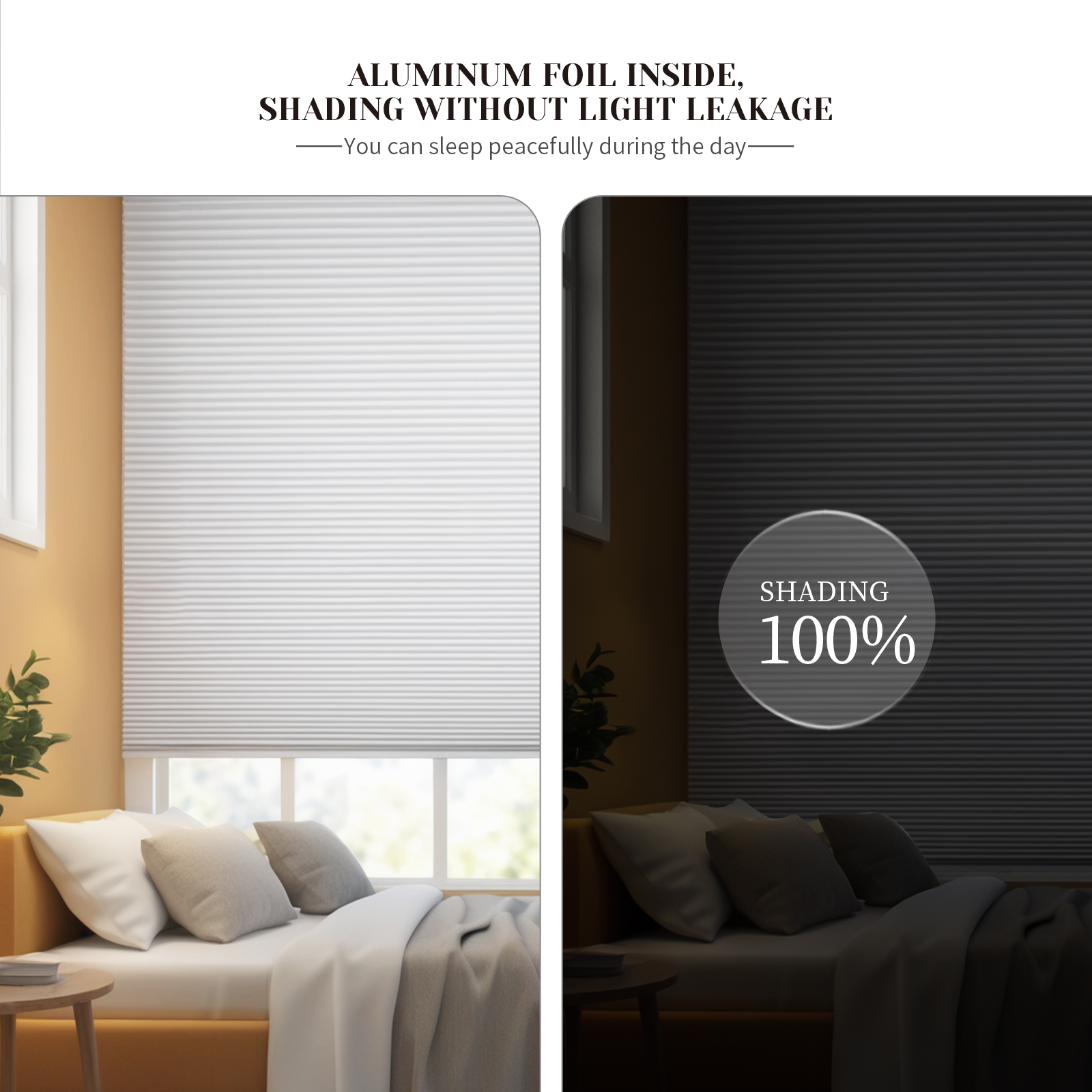 Honeycomb blinds, with their unique honeycomb structure, offer excellent thermal insulation and soundproofing — blocking outdoor heat in the summer, retaining indoor warmth in the winter, and effectively reducing external noise to create a peaceful environment for homes or offices. The built-in aluminum foil layer can block 100% of sunlight and UV rays, easily creating a dark and restful space to support quality sleep, making them especially suitable for bedrooms and media rooms.